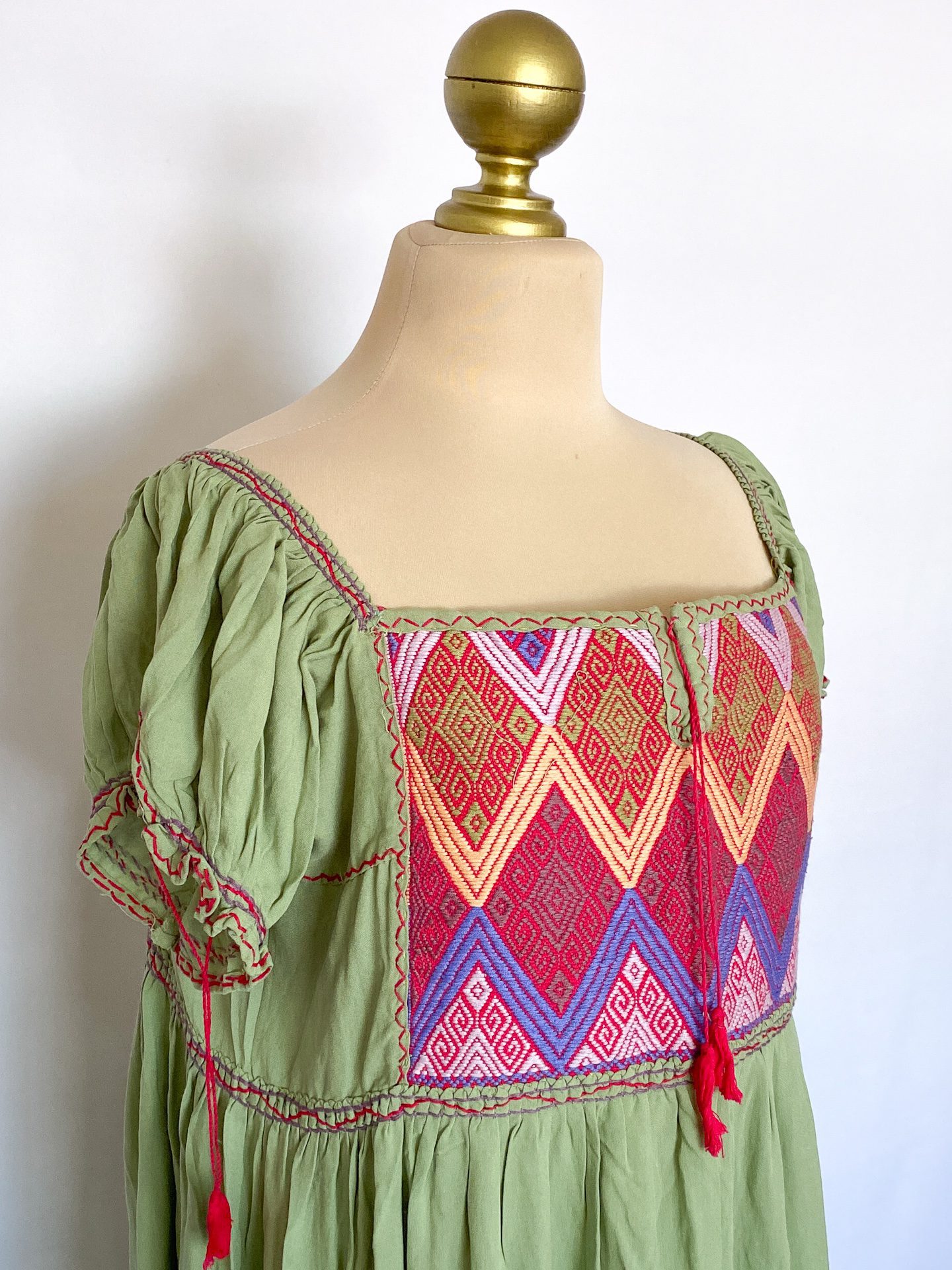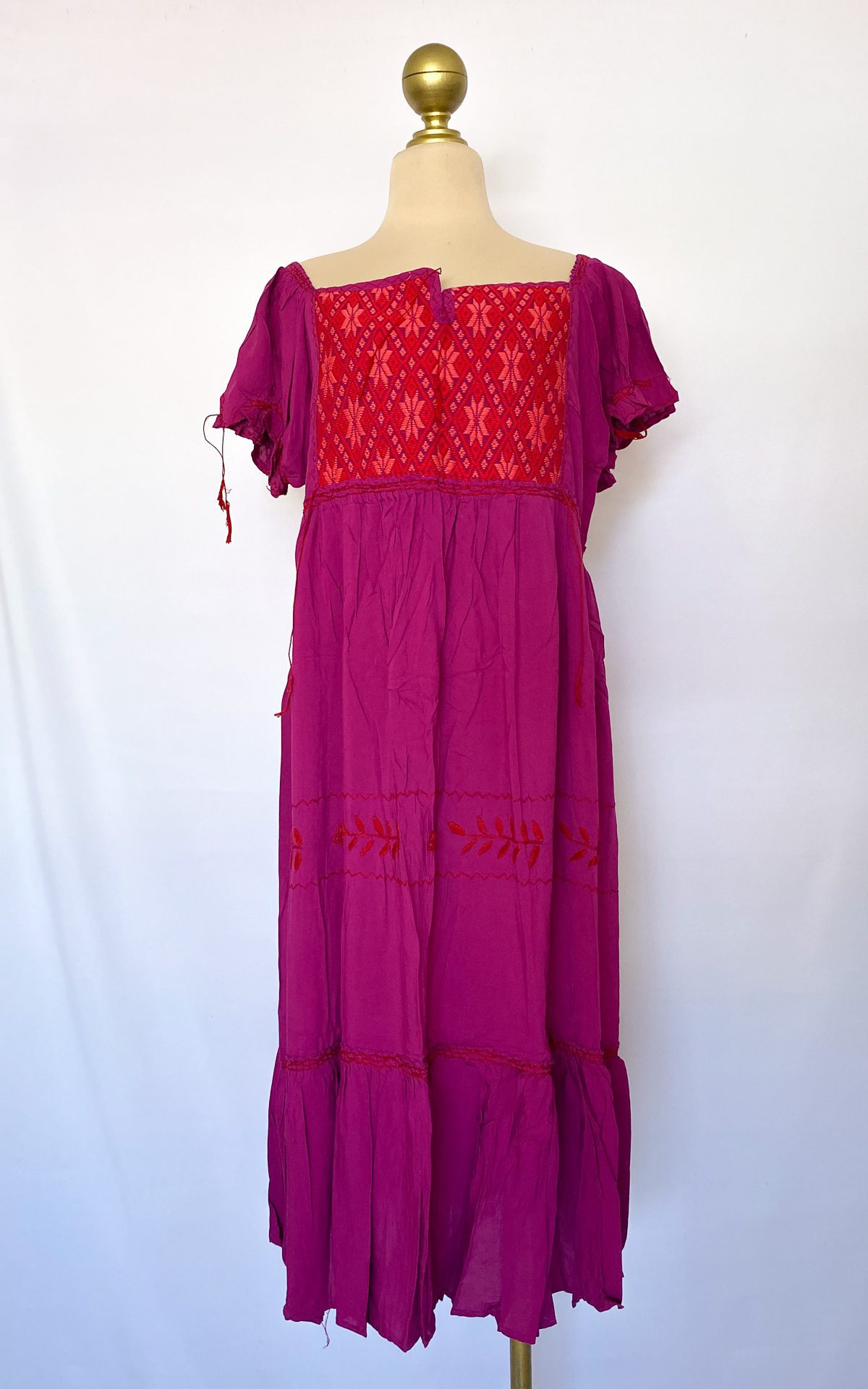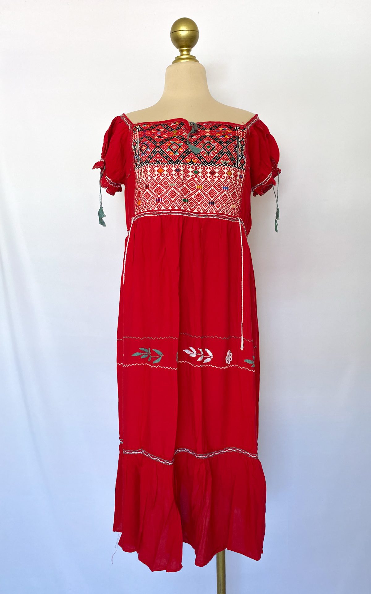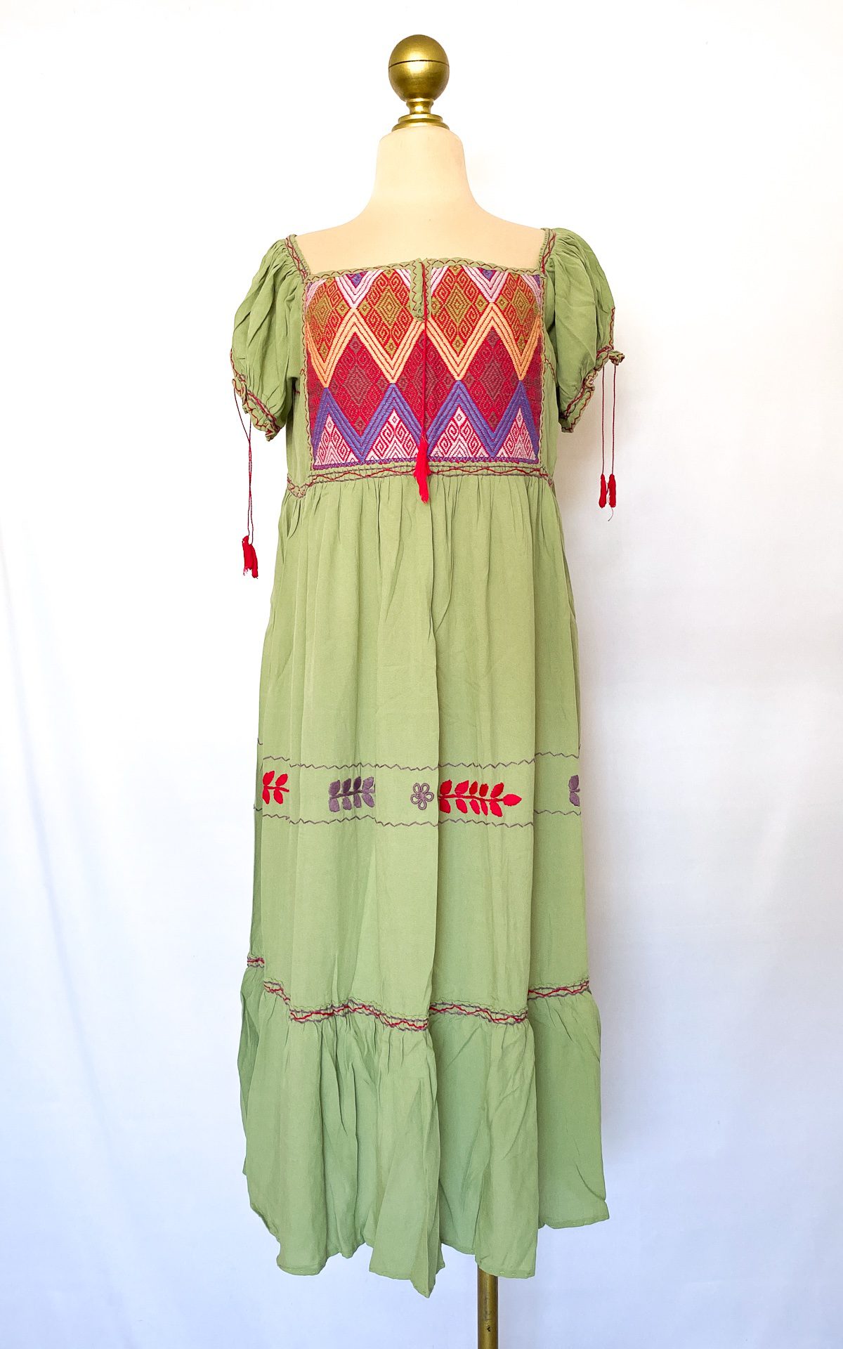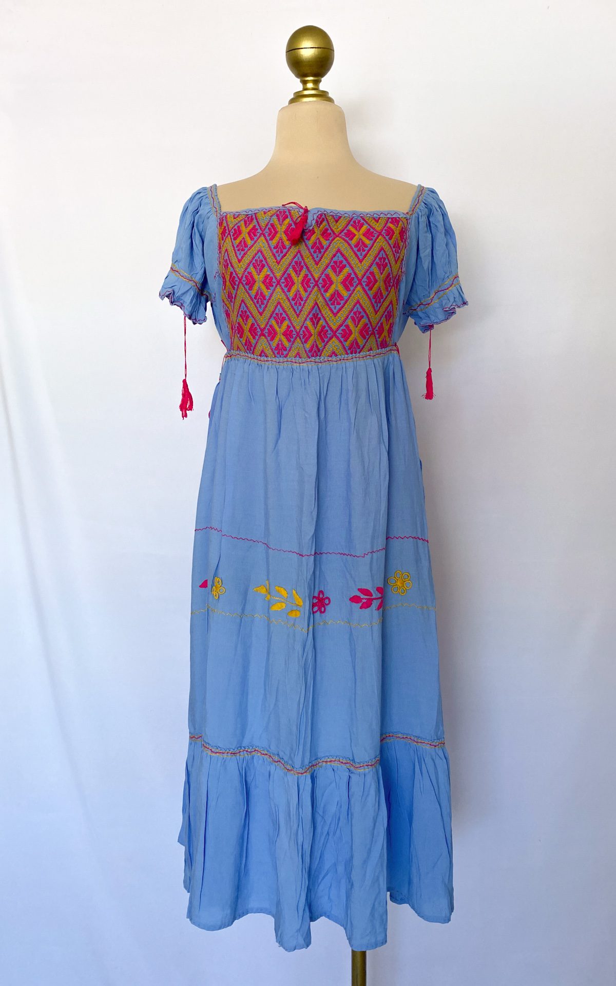 Bordada en pedal de cintura con acabados a mano, sobre tela rayón. Unitalla desde una XS hasta una 38. Tiene cintas ajustables a los lados.