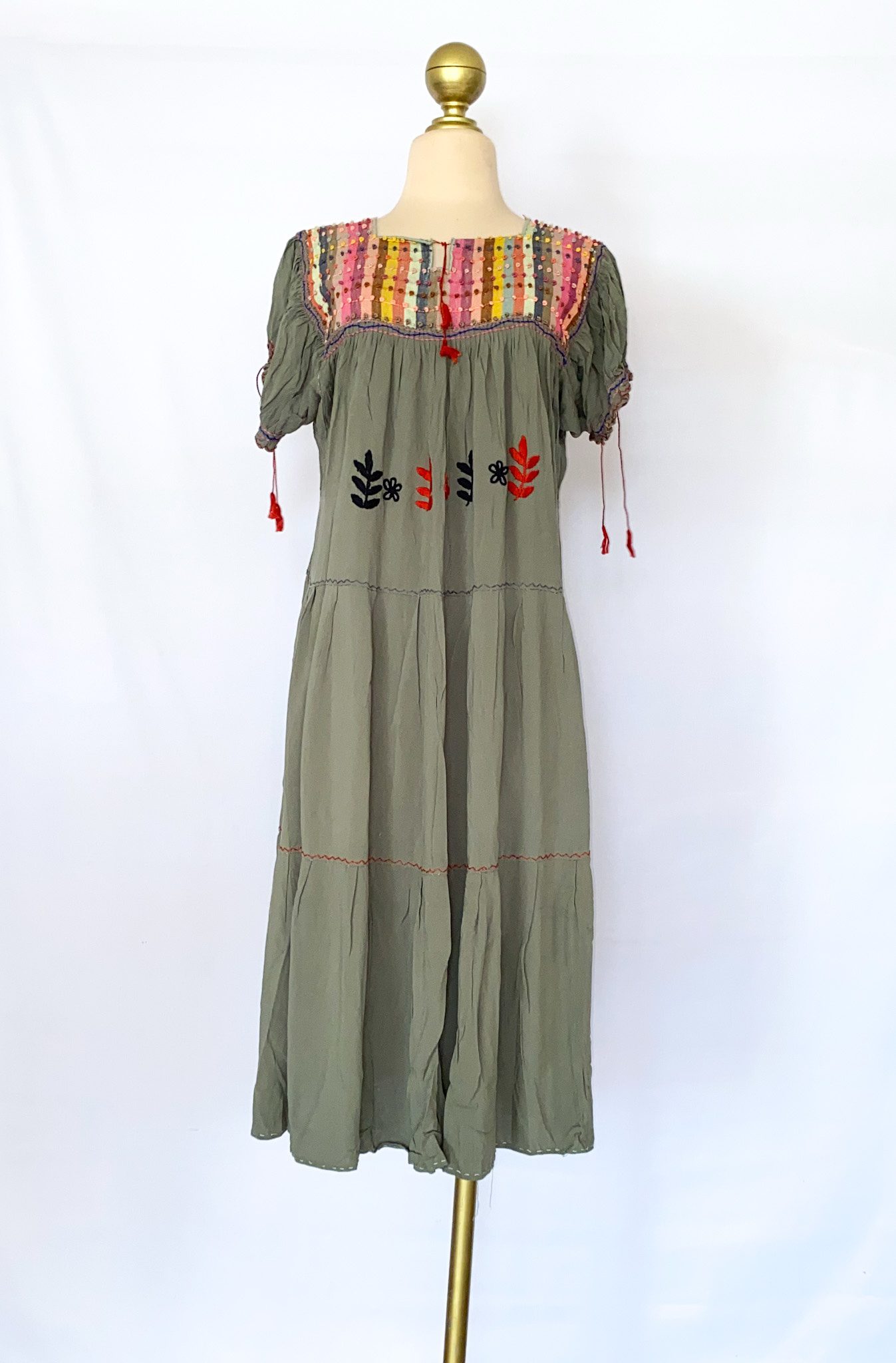 Bordada en pedal de cintura con acabados a mano, sobre tela rayón. Unitalla desde una XS hasta una 38. Tiene cintas ajustables a los lados.
