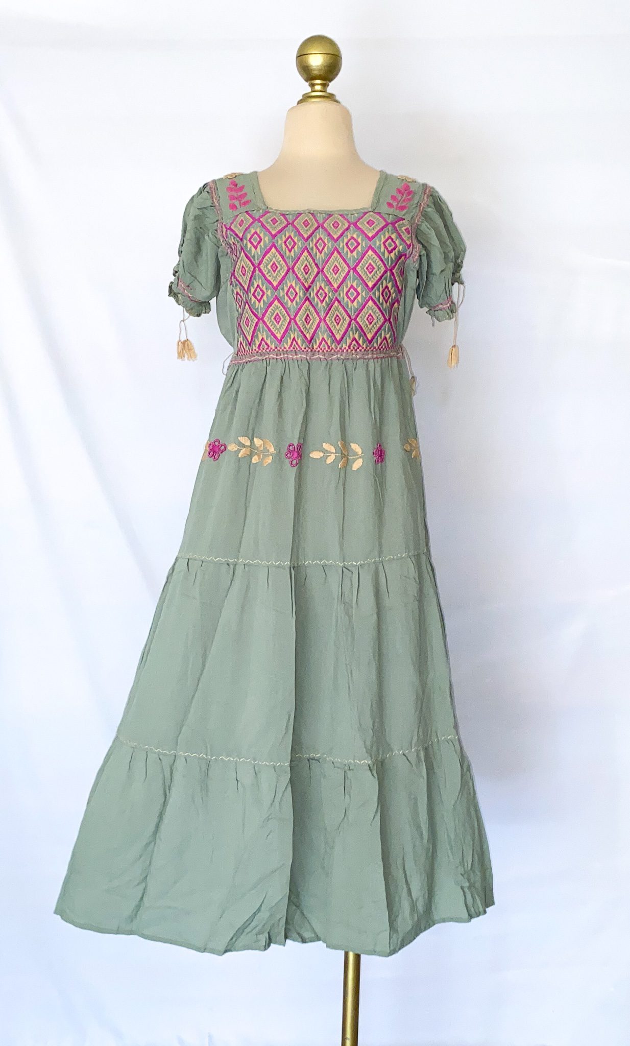 Bordada en pedal de cintura con acabados a mano, sobre tela rayón. Unitalla desde una XS hasta una 38. Tiene cintas ajustables a los lados.