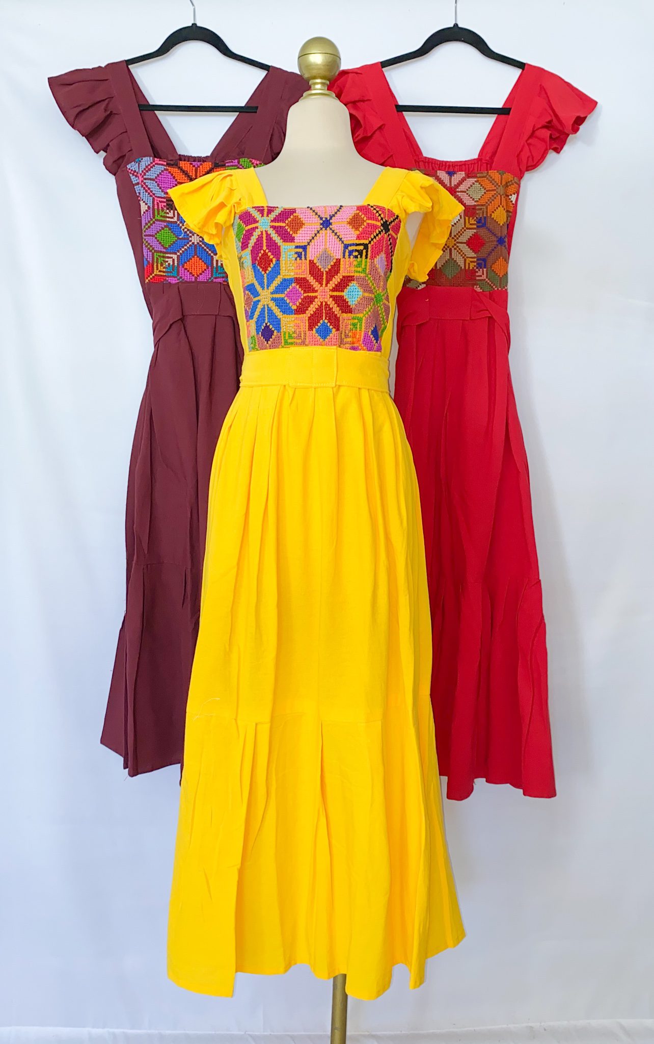 Vestido con pechera en punto de cruz, sobre tela de algodón. Es unitalla, desde una XS hasta una 38 máximo. Tiene cintas ajustables y elástico.